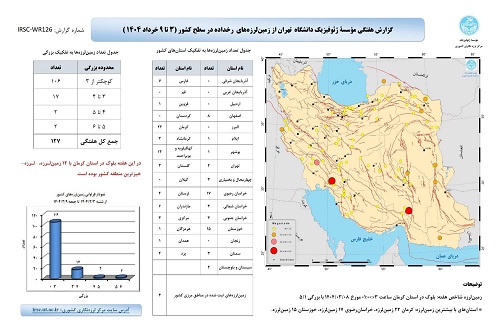 طبق آخرین گزارش مؤسسه ژئوفیزیک دانشگاه، شبکههای لرزهنگاری مرکز لرزهنگاری کشوری در بازه زمانی ۳ تا ۹ خردادماه در مجموع ۱۲۷ زمینلرزه را ثبت کردند.