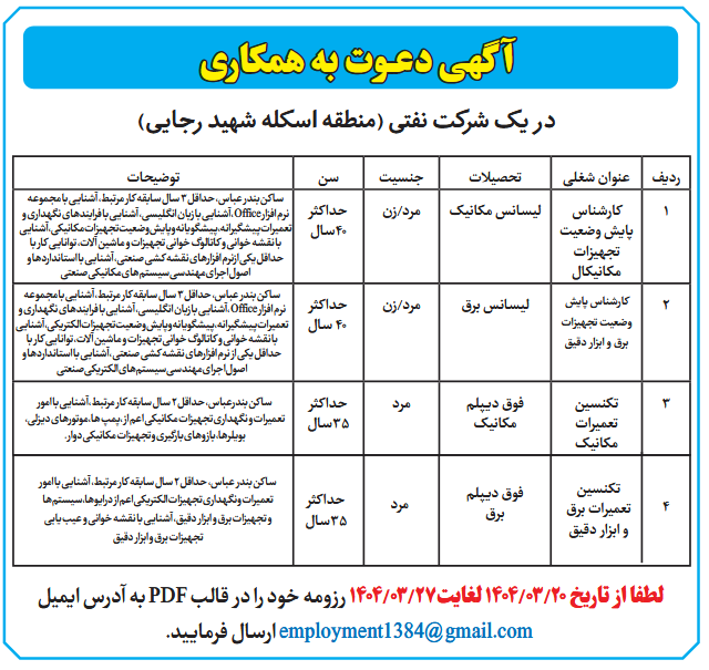 آگهی دعوت به همکاری در یک شرکت نفتی (منطقه اسکله شهید رجایی)