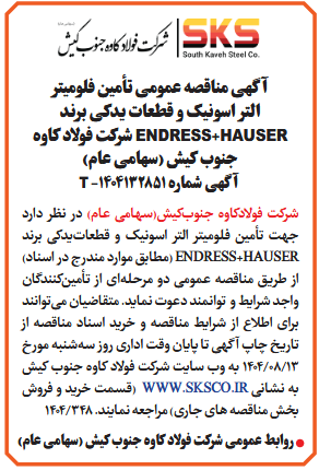 شركت فولادکاوه جنوبکیش(سهامی عام) در نظر دارد جهت تأمین فلومیتر التر اسونیک و قطعاتیدکی برند ENDRESS+HAUSER (مطابق موارد مندرج در اسناد) از طريق مناقصه عمومى دو مرحلهای از تأمینکنندگان واجد شرایط و توانمند دعوت نماید. متقاضیان میتوانند برای اطلاع از شرایط مناقصه و خرید اسناد مناقصه از تاریخ چاپ آگهی تا پایان وقت اداری روز سهشنبه مورخ 13/08/1404 به وب سایت شرکت فولاد کاوه جنوب کیش به نشانی WWW.SKSCO.IR (قسمت خرید و فروش بخش مناقصه های جاری) مراجعه نمایند.