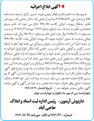 بدینوسیله به خانم ماهرخ باوقار زعیمی فرزند حسین دارای شماره شناسنامه 353 و بشماره ملی 3479288790 صادره از حاجی آباد ساكن حاجی آباد -روستای طارم، بدهکار پرونده اجرائی كلاسه 140400048 ابلاغ می شود كه خانم منیژه امامدادی طارم به استناد سند ازدواج شماره 3719 مورخه23/8/1371 و نسبت به مبلغ 3,578,400,000 ریال بابت اصل طلب و مبلغ 178,920,000 ریال بابت نیمعشر دولتی مبادرت به صدور اجرائیه نموده كه پرونده اجرائی تحت كلاسه 140400048 در شعبه اجراء این اداره تشكیل و در جریان رسیدگی می باشد لهذا نظر به اینكه حسب گزارش و گواهی مامور اداره پست حاجی آباد امكان ابلاغ اوراق اجرائیه به شما میسر نگردیده و آدرس جدید خود را نیز اعلام ننموده اید و از طرفی بستانكار پرونده نیز قادر به معرفی آدرس فعلی شما نمی باشد لذا حسب تقاضای شماره وارده 140405023120000314 مورخه27/7/1404 بستانكار و در اجرای ماده 18 آئین نامه اجرای مفاد اسناد رسمی لازم الاجراء مفاد اجرائیه در یك نوبت بشرح فوق آگهی میگردد شایان ذكر است چنانچه ظرف مدت ده روز از تاریخ انتشار این آگهی كه روز رسمی ابلاغ اجرائیه محسوب می شود نسبت به پرداخت دین خود اقدام ننمائید عملیات اجرائی وفق مقررات علیه شما تعقیب و به جزء این آگهی و آگهی مزایده آگهی دیگری منتشر نخواهد شد ./ تاریخ انتشار: 30/07/1404
