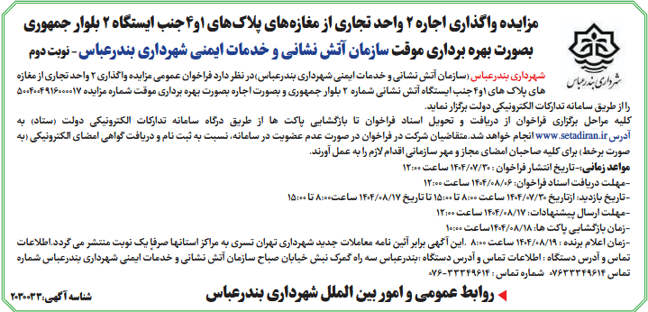مزایـده واگذاری اجاره 2 واحد تجاری از مغازههای پلاکهای 1و4جنب ایستگاه 2 بلوار جمهوری بصورت بهره برداری موقت سازمان آتش نشانی و خدمات ایمنی شهرداری بندرعباس - نوبت دوم