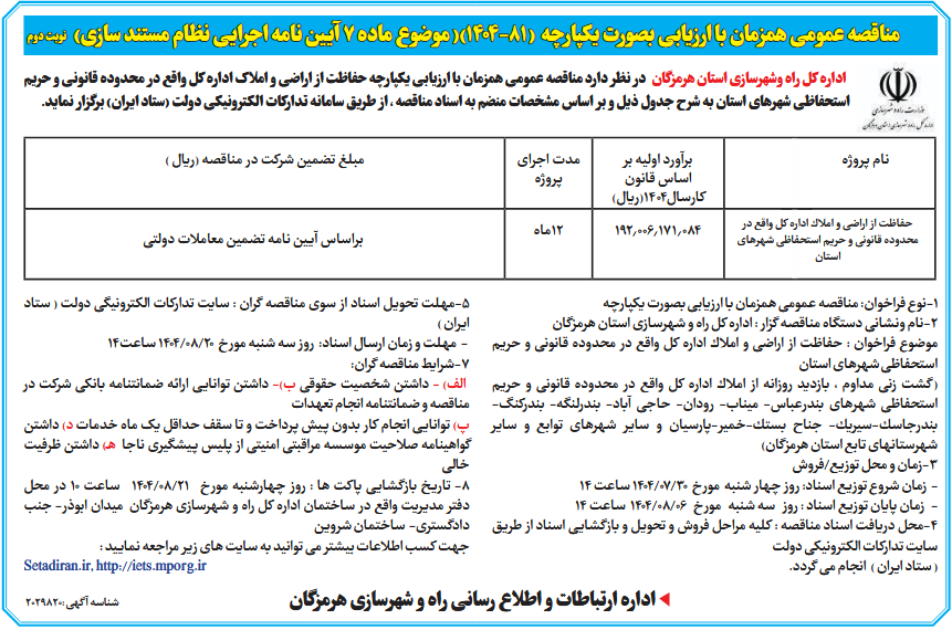 اداره کل راه وشهرسازی استان هرمزگان در نظر دارد مناقصه عمومی همزمان با ارزیابی یکپارچه حفاظت از اراضی و املاک اداره کل واقع در محدوده قانونی و حریم استحفاظی شهرهای استان به شرح جدول ذیل و بر اساس مشخصات منضم به اسناد مناقصه ، از طریق سامانه تدارکات الکترونیکی دولت (ستاد ایران) برگزار نماید.