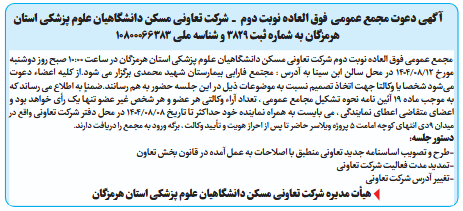 مجمع عمومی فوق العاده نوبت دوم شرکت تعاونی مسکن دانشگاهیان علوم پزشکی استان هرمزگان در ساعت 10:00 صبح روز دوشنبه مورخ 12/08/1404 در محل سالن ابن سینا به آدرس : مجتمع فارابی بیمارستان شهید محمدی برگزار می شود.از کلیه اعضاء دعوت