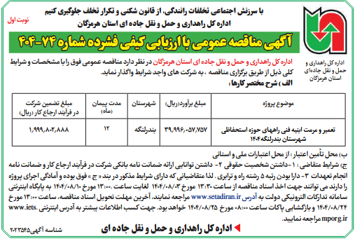 ج) شرایط متقاضی : 1 -داشتن شخصیت حقوقی 2- داشتن توانایی ارائه ضمانت نامه بانکی شرکت در فرآيند ارجاع كار و ضمانت نامه انجام تعهدات 3- دارا بودن رتبه 5 رشته راه و ترابری . لذا متقاضیانی که دارای شرایط مذکور در بند « ج » فوق بوده و آمادگی اجرای پروژه را دارند می توانند جهت اخذ اسناد مناقصه از ساعت 13:30 مورخ 03/08/1404 لغایت ساعت .13:00 مورخ 10/08/1404 به پایگاه اینترنتی سامانه تدارکات الترونیکی دولت به آدرس www.setadiran.ir مراجعه نمایند، آخرین مهلت تحویل اسناد مناقصه، ساعت 13:00 مورخ 24/08/1404 و بازگشایی پاکات ساعت 08:00 مورخ 25/08/1404 خواهد بود. جهت کسب اطلاعات بیشتر به آدرس اینترنتی www.iets.mporg.ir مراجعه نمایید.
