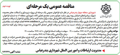 شهرداری منطقه چهار بندرعباس در نظر دارد فراخوان عمومی یک مرحله ای پروژه «زیرسازی و آسفالت معابر محدوده شهرک پیامبراعظم(خیابان روبه روی سایت معراج و جنب مجتمع تجاری لاله) شهرداری منطقه 4» به شماره فراخوان: 2004004916000061 را از طریق سامانه تدارکات الکترونیکی دولت برگزار نماید.کلیه مراحل برگزاری فراخوان از دریافت و تحویل اسناد فراخوان تا بازگشایی پاکتها از طریق درگاه سامانه تدارکات الکترونیکی دولت (ستاد) به آدرس www.setadiran.ir انجام خواهد شد.متقاضیان شرکت در فراخوان در صورت عدم عضویت در سامانه، نسبت به ثبت نام و دریافت گواهی امضای الکترونیکی (به صورت برخط) برای کلیه صاحبان امضای مجاز و مهر سازمانی اقدام لازم را به عمل آورند.