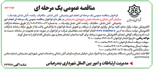 سازمان آتش نشانی و خدمات ایمنی شهرداری بندرعباس در نظر دارد فراخوان مناقصه عمومی یک مرحله ای انجام امور پشتیبانی ، آتش نشان ، مکانیک ، راننده ( آتش نشان پایه یک )... به شماره 2004004916000063 را از طریق سامانه تدارکات الکترونیکی دولت برگزار نماید.کلیه مراحل برگزاری فراخوان از دریافت و تحویل اسناد فراخوان تا بازگشایی پاکت ها از طریق درگاه سامانه تدارکات الکترونیکی دولت (ستاد) به آدرس www.setadiran.ir انجام خواهد شد.متقاضیان شرکت در فراخوان در صورت عدم عضویت در سامانه، نسبت به ثبت نام و دریافت گواهی امضای الکترونیکی (به صورت برخط) برای کلیه صاحبان امضای مجاز و مهر سازمانی اقدام لازم را به عمل آورند.