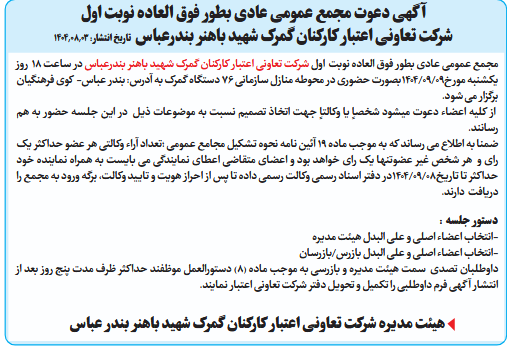 مجمع عمومی عادی بطور فوق العاده نوبت اول شرکت تعاونی اعتبار کارکنان گمرک شهید باهنر بندرعباس در ساعت ۱8 روز