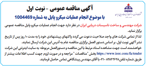 شركت مهندسی و ساخت تاسیسات دریایی ایران در نظر دارد جهت انجام عملیات میکرو پایل مناقصه عمومی برگزار نماید.