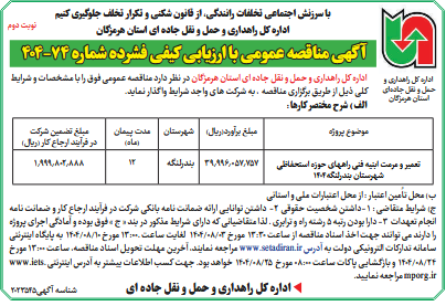 ج) شرایط متقاضی : 1 -داشتن شخصیت حقوقی 2- داشتن توانایی ارائه ضمانت نامه بانکی شرکت در فرآيند ارجاع كار و ضمانت نامه انجام تعهدات 3- دارا بودن رتبه 5 رشته راه و ترابری . لذا متقاضیانی که دارای شرایط مذکور در بند « ج » فوق بوده و آمادگی اجرای پروژه را دارند می توانند جهت اخذ اسناد مناقصه از ساعت 13:30 مورخ 03/08/1404 لغایت ساعت .13:00 مورخ 10/08/1404 به پایگاه اینترنتی سامانه تدارکات الترونیکی دولت به آدرس www.setadiran.ir مراجعه نمایند، آخرین مهلت تحویل اسناد مناقصه، ساعت 13:00 مورخ 24/08/1404 و بازگشایی پاکات ساعت 08:00 مورخ 25/08/1404 خواهد بود. جهت کسب اطلاعات بیشتر به آدرس اینترنتی www.iets.mporg.ir مراجعه نمایید.