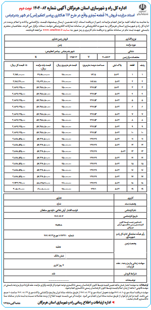 اسناد مزایده فروش 19 قطعه تجاری واقع در طرح 116 هکتاری پیامبر اعظم (ص) در شهر بندرعباس نوبت دوم