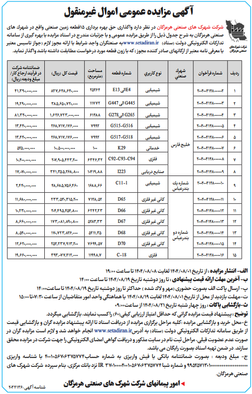 شرکت شهرک های صنعتی هرمزگان در نظر دارد واگذاری حق بهره برداری 15قطعه زمین صنعتی واقع در شهرك های صنعتی هرمزگان به شرح جدول ذیل را از طریق مزایده عمومی و با جزئیات مندرج در اسناد مزایده با بهره گیری از سامانه تدارکات الکترونیکی دولت (ستاد) www.setadiran.irبه صنعتگران واجد شرایط با ارائه مجوز لازم (جواز تاسیس معتبر یا معرفی نامه معتبر از ارگانهای صادر كننده مجوز) كه با زون قطعه مورد درخواست مطابقت داشته باشد واگذار نماید.