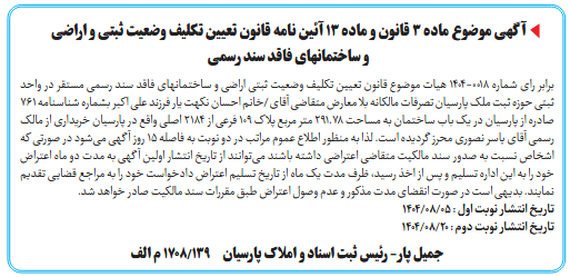 برابر رای شماره ۰۰۱۸-۱۴۰۴ هیات موضوع قانون تعیین تکلیف وضعیت ثبتی اراضی و ساختمانهای فاقد سند رسمی مستقر در واحد ثبتی حوزه ثبت ملک پارسیان تصرفات مالکانه بلا معارض متقاضی آقای /خانم احسان نکهت یار فرزند علی اکبر بشماره شناسنامه ۷۶۱ صادره از پارسیان در یک باب ساختمان به مساحت ۲۹۱.۷۸ متر مربع پلاک ۱۰۹ فرعی از ۲۱۸۴ اصلی واقع در پارسیان خریداری از مالک رسمی آقای یاسر نصوری محرز گردیده است. لذا به منظور اطلاع عموم مراتب در دو نوبت به فاصله ۱۵ روز آگهی میشود در صورتی که اشخاص نسبت به صدور سند مالکیت متقاضی اعتراضی داشته باشند میتوانند از تاریخ انتشار اولین آگهی به مدت دو ماه اعتراض خود را به این اداره تسلیم و پس از اخذ رسید، ظرف مدت یک ماه از تاریخ تسلیم اعتراض دادخواست خود را به مراجع قضایی تقدیم نمایند. بدیهی است در صورت انقضای مدت مذکور و عدم وصول اعتراض طبق مقررات سند مالکیت صادر خواهد شد.