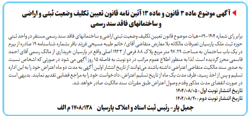 برابر رای شماره ۱۴۰۴-۰۰۱۹هیات موضوع قانون تعیین تکلیف وضعیت ثبتی اراضی و ساختمانهای فاقد سند رسمی مستقر در واحد ثبتی حوزه ثبت ملک پارسیان تصرفات مالکانه بلا معارض متقاضی آقای/ خانم طیبه مسیحی فرزند باقر بشماره شناسنامه ۱۹ صادره از بیرم در یک باب ساختمان به مساحت ۹۷.۲۹ متر مربع پلاک ۸۸ فرعی از ۱۹۳۳ اصلی واقع در پارسیان خریداری از مالک رسمی آقای احمد قاسمی محرز گردیده است. لذا به منظور اطلاع عموم مراتب در دو نوبت به فاصله ۱۵ روز آگهی می شود در صورتی که اشخاص نسبت به صدور سند مالکیت متقاضی اعتراضی داشته باشند می‌توانند از تاریخ انتشار اولین آگهی به مدت دو ماه اعتراض خود را به این اداره تسلیم و پس از اخذ رسید، ظرف مدت یک ماه از تاریخ تسلیم اعتراض، دادخواست خود را به مراجع قضایی تقدیم نمایند. بدیهی است در صورت انقضای مدت مذکور وقدم وصول اعتراض طبق مقررات سند مالکیت صادر خواهد شد.