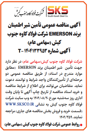 شركت فولاد کاوه جنوب کیش(سهامی عام) در نظر دارد جهت تأمین شیر اطمینان برند EMERSON (مطابق موارد مندرج در اسناد) از طريق مناقصه عمومى دو مرحلهای از تأمینکنندگان واجد شرایط و توانمند دعوت نماید. متقاضیان میتوانند برای اطلاع از شرایط مناقصه و خرید اسناد مناقصه از تاریخ چاپ آگهی تا پایان وقت اداری روز سهشنبه مورخ 20/08/1404 به وب سایت شرکت فولاد کاوه جنوب کیش به نشانی WWW.SKSCO.IR (قسمت خرید و فروش بخش مناقصه های جاری) مراجعه نمایند.