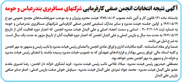 باستناد ماده ۱۳۱ قانون کار و آئین نامه مصوب 03/۰۸/1389 هیئت محترم وزیران و به موجب صورتجلسههای مجمع عمومی مورخ 19/05/1404 و اولین جلسه هیئت مدیره و سایر مدارک تسلیمی انجمن صنفی کارفرمایی شرکتهای مسافربری بندرعباس و حومه