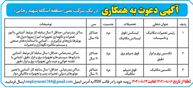 یک شرکت فعال در حوزه نفت و انرژی مستقر در منطقه اسکله شهید رجایی بندرعباس، از متقاضیان واجد شرایط برای سه عنوان شغلی، شامل رئیس تعمیرات مکانیک و تأسیسات، تکنسین برق و ابزار دقیق، و تکنسین مکانیک دعوت به همکاری میکند. داوطلبان میتوانند رزومه خود را از تاریخ ۶ تا ۱۳ آبان ۱۴۰۴ در قالب PDF به ایمیل اعلامشده ارسال نمایند.