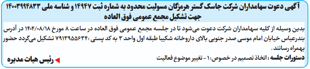 بدین وسیله از کلیه سهامداران شرکت دعوت میشود تا در جلسه مجمع عمومی فوق العاده در ساعت ۸ مورخ 18/۰۸/1404 در آدرس بندرعباس خیابان امام موسی صدر جنوبی بالای داروخانه شکیبا طبقه اول واحد ۳ به کد پستی :7913955634 تشکیل میگردد حضور بهمراه رسانند .