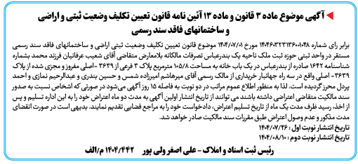برابر رای شماره ۱۴۰۴۶۰۳۲۳۱۳۶۰۰۱۰۴۸ مورخ 01/۰۷/1404 موضوع قانون تعیین تکلیف وضعیت ثبتی اراضی و ساختمانهای فاقد سند رسمی مستقر در واحد ثبتی حوزه ثبت ملک ناحیه یک بندرعباس تصرفات مالکانه بلامعارض متقاضی آقای شعیب عرفانیان فرزند محمد بشماره شناسنامه ۱۶۴۲ صادره از بندرعباس در یک باب خانه به مساحت 8/105 مترمربع پلاک ۳ فرعی از ۳۶۳۹ -اصلی مفروز و مجزی شده از پلاک ۳۶۳۹- اصلی واقع در سه راه جهانبار خریداری از مالک رسمی آقای میرهاشم امیرزاده شمس و حسین بندری و عبدالرحیم نمازی و احمد پردل محرز گردیده است. لذا به منظور اطلاع عموم مراتب در دو نوبت به فاصله ۱۵ روز آگهی میشود در صورتی که اشخاص نسبت به صدور سند مالکیت متقاضی اعتراضی داشته باشند می توانند از تاریخ انتشار اولین آگهی به مدت دو ماه اعتراض خود را به این اداره تسلیم و پس از اخذ، رسید ظرف مدت یک ماه از تاریخ تسلیم اعتراض، دادخواست خود را به مراجع قضایی تقدیم نمایند. بدیهی است در صورت انقضای مدت مذکور و عدم وصول اعتراض طبق مقررات سند مالکیت صادر خواهد شد.