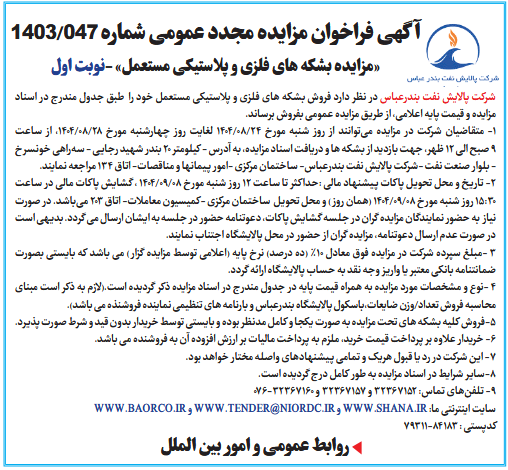 شرکت پالایش نفت بندرعباس در نظر دارد فروش بشکه های فلزی و پلاستیکی مستعمل خود را طبق جدول مندرج در اسناد مزایده و قیمت پایه اعلامی، از طریق مزایده عمومی بفروش برساند.