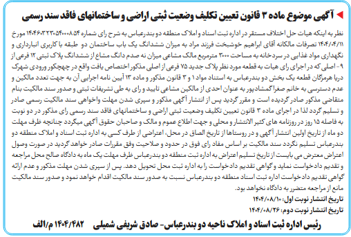 نظر به اینکه هیات حل اختلاف مستقر در اداره ثبت اسناد و املاک منطقه دو بندرعباس به شرح رای شماره ۱۴۰۴۶۰۳۲۳۰۵۴۰۰۰۸۵4 مورخ 11/۰۴/1404 تصرفات مالکانه آقای ابراهیم خوشبخت فرزند مراد به میزان ششدانگ یک باب ساختمان دو طبقه با کاربری انبارداری و نگهداری مواد غذایی در سردخانه به مساحت 3000 مترمربع مالک مشاعی میزان نه صدم دانگ مشاع از ششدانگ پلاک ثبتی ۱۲ فرعی از 9- اصلی که در اجرای رای هیات به قطعه مورد نظر پلاک جدید 75 فرعی از اصلی مذکور اختصاص یافت واقع در چهچکور ورودی شهرک دریا هرمزگان قطعه یک بخش دو بندرعباس به استناد مواد ۱ و ۳ قانون مذکور و ماده ۱۳ آیین نامه اجرایی آن به جهت تعدد مالکین و عدم دسترسی به خانم صغرا گمشادپور به عنوان احدی از مالکین مشاعی تایید و رای به طی تشریفات ثبتی و صدور سند مالکیت بنام متقاضی مذکور صادر گردیده است و مقرر گردید پس از انتشار آگهی مذکور و سپری شدن مهلت واخواهی سند مالکیت رسمی صادر و تسلیم گردد لذا در اجرای ماده ۳ قانون تعیین تکلیف وضعیت ثبتی اراضی و ساختمانهای فاقد سند رسمی رای مذکور در دو نوبت