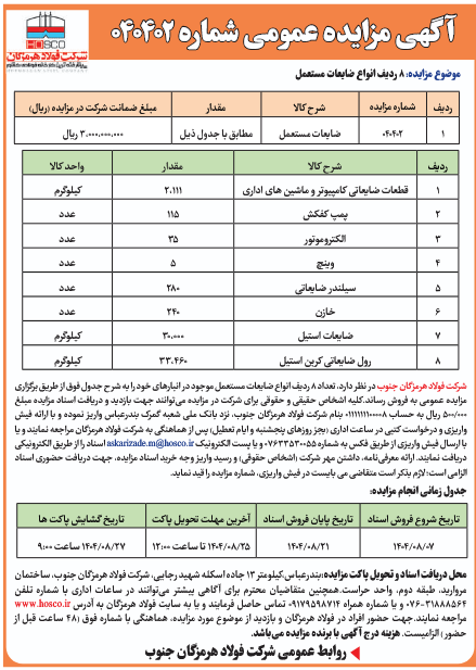 شرکت فولاد هرمزگان جنوب در نظر دارد، تعداد 8 ردیف انواع ضایعات مستعمل موجود در انبارهای خود را به شرح جدول فوق از طریق برگزاری مزایده عمومی به فروش رساند.کلیه اشخاص حقیقی و حقوقی برای شركت در مزایده میتوانند جهت بازدید و دریافت اسناد مزایده مبلغ 000/500 ریال به حساب 0111111100008 بنام شركت فولاد هرمزگان جنوب، نزد بانک ملی شعبه گمرک بندرعباس واریز نموده و با ارائه فیش واریزی و درخواست كتبی در ساعت اداری (بجز روزهای پنجشنبه و ایام تعطیل) پس از هماهنگی به شركت فولاد هرمزگان مراجعه نمایند و یا با ارسال فیش واریزی از طریق فکس به شماره 07633530055 و یا پست الکترونیک askarizade.m@hosco.ir اسناد را از طریق الکترونیکی دریافت نمایند. ارائه معرفینامه، داشتن مهر شركت (اشخاص حقوقی) و رسید واریز وجه خرید اسناد مزایده، جهت دریافت حضوری اسناد الزامی است؛ لازم بذکر است متقاضی می بایست در فیش واریزی، شماره مزایده را قید نماید.