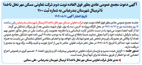 جلسه مجمع عمومی عادی بطور فوق العاده نوبت دوم شرکت تعاونی مسکن مهر نخل ناخدا تا ترمینال شهرستان بندرعباس راس ساعت 16 روز پنجشنبه مورخ 22/08/1404 در محل کارگاه پروژه به آدرس: سه راه برق، بلوار شهید سلیمی بعد از پل زیرگذر تشکیل می گردد.