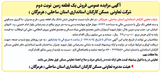 شرکت تعاونی کارکنان استانداری استان ساحلی ( هرمزگان ) در نظر دارد نسبت به فروش شش دانگ یک قطعه زمین ( طرح مدیران ) با کاربری مسکونی و سند قطعی تک برگی با دسترسی عالی به مساحت 4433 ( چهار هزارو چهارصد و سی و سه متر مربع ) واقع در بندرعباس بلوار امام خمینی ( ره ) انتهای خیابان حر ( جنب پمپ بنزین بلال ) بلوار شهید آبسواران مابین مجتمع تعاونی بنیاد مسکن و مجتمع تعاونی نیروی انتظامی ( علی ابن ابیطالب ) به قیمت پایه به ازای هرمتر مربع -/000ر000ر330 ریال ( سیصد و سی میلیون ریال) اقدام نماید .