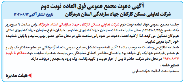 جلسه مجمع عمومی فوق العاده نوبت دوم شرکت تعاونی مسکن کارکنان جهاد سازندگی استان هرمزگان راس ساعت 9 صبح روز یکشنبه مورخ25/08/1404 در محل سالن اجتماعات سازمان جهاد کشاورزی به آدرس: خیابان طلوع سازمان جهاد کشاورزی استان هرمزگان تشکیل می گردد. لذا از کلیه اعضاء دعوت می شود راس ساعت مقرر در محل مذکور حضور بهم رسانید و یا وکیل /نماینده خود را کتبا معرفی نمایید.