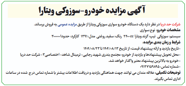شرکت حد دریا در نظر دارد یک دستگاه خودرو سواری سوزوکی ویتارا از طریق مزایده عمومی به فروش برساند.
