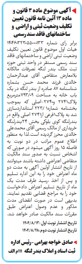 برابر رای شماره ۱۴۰۴۶۰۳۲۳۰۵۵۰۰۰۱33 هیات اول موضوع قانون تعیین تکلیف وضعیت ثبتی اراضی و ساختمانهای فاقد سند رسمی مستقر در واحد ثبتی حوزه ثبت ملک بندر لنگه تصرفات مالکانه بلامعارض متقاضی آقای عبدالرحمان خالدی فرزند محمد حسن بشماره شناسنامه ۸۷ صادره از بندر لنگه در یک باب خانه به مساحت 09/793مترمربع پلاک2741 و2740-اصلی که بموجب بخشنامه شماره1 /223 استانداردسازی شد به پلاک1فرعی از2741 اصلی واقع در بندرلنگه کوی بلوکی بخش 24بندرلنگه خریداری از مالک رسمی آقای محمدعلی خالدی محرز گردیده است.لذا به منظور اطلاع عموم مراتب در دو نوبت به فاصله ۱۵ روز آگهی میشود در صورتی که اشخاص نسبت به صدور سند مالکیت متقاضی اعتراضی داشته باشند میتوانند از تاریخ انتشار اولین آگهی به مدت دو ماه اعتراض خود را به این اداره تسلیم و پس از اخذ ،رسید ظرف مدت یک ماه از تاریخ تسلیم اعتراض دادخواست خود را به مراجع قضایی تقدیم نمایند. بدیهی است در صورت انقضای مدت مذکور و عدم وصول اعتراض طبق مقررات سند مالکیت صادر خواهد شد.