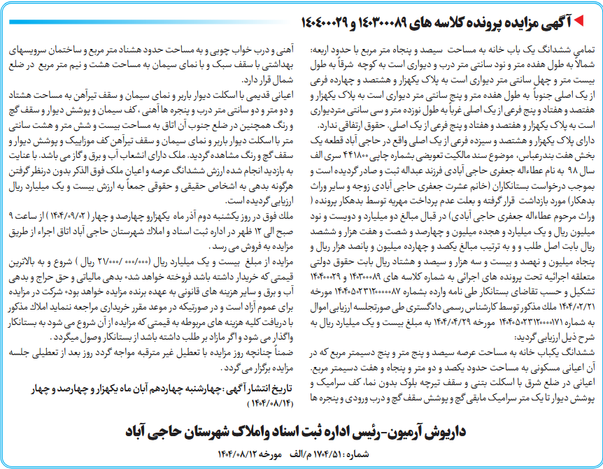 ملك فوق در روز یکشنبه دوم آذر ماه یكهزارو چهارصد و چهار ( 02/09/1404 ) از ساعت 9 صبح الی 12 ظهر در اداره ثبت اسناد و املاك شهرستان حاجی آباد اتاق اجراء از طریق مزایده به فروش می رسد .