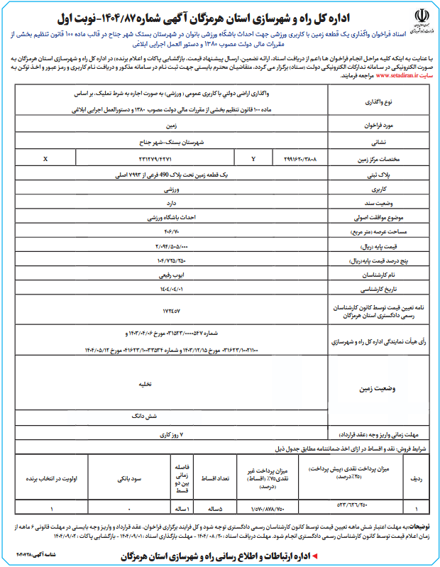 اسناد فراخوان واگذاری یک قطعه زمین با کاربری ورزشی نوبت اولجهت احداث باشگاه ورزشی بانوان در شهرستان بستک شهر جناح در قالب ماده 100 قانون تنظیم بخشی از مقررات مالی دولت مصوب 1380 و دستور العمل اجرایی ابلاغی