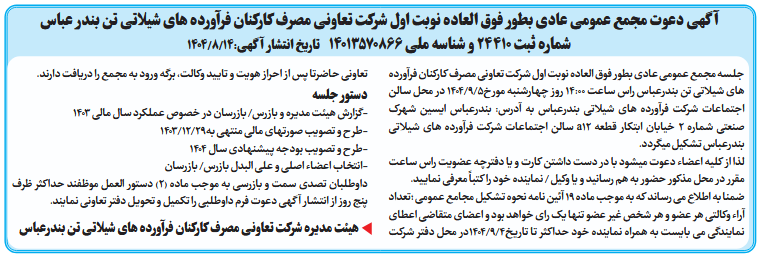 جلسه مجمع عمومی عادی بطور فوق العاده نوبت اول شرکت تعاونی مصرف کارکنان فرآورده های شیلاتی تن بندرعباس راس ساعت ۱۴:۰۰ روز چهارشنبه مورخ5/9/1404 در محل سالن اجتماعات شرکت فرآورده های شیلاتی بندرعباس به آدرس: بندرعباس ایسین شهرک صنعتی شماره ۲ خیابان ابتکار قطعه a12 سالن اجتماعات شرکت فرآورده های شیلاتی بندرعباس تشکیل میگردد.