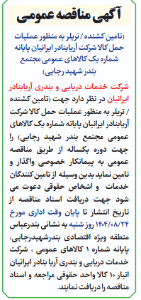 شرکت خدمات دریایی و بندری آریابنادر ایرانیان در نظر دارد جهت (تامین کشنده / تریلر به منظور عملیات حمل کالا شرکت آریابنادر ایرانیان پایانه شماره یک کالاهای عمومی مجتمع بندر شهید رجایی) را جهت دوره یکساله از طریق مناقصه عمومی به پیمانکار خصوصی واگذار و تامین نماید بدین وسیله از تامین کنندگان خدمات و اشخاص حقوقی دعوت می شود جهت دریافت اسناد مناقصه از تاریخ انتشار تا پایان وقت اداری مورخ 24/08/1404 روز شنبه به نشانی بندرعباس منطقه ویژه اقتصادی بندرشهیدرجایی، پایانه شماره 1 کالاهای عمومی ، شرکت خدمات دریایی و بندری آریا بنادر ایرانیان انبار 10 کالا واحد حقوقی مراجعه و اسناد مناقصه را دریافت نمایند.
