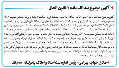 آگهی موضوع بند الف ماده ۷ قانون الحاق موادی به قانون ساماندهی و حمایت از تولید و عرضه مسکن مصوب ۱۳۸۸ مستقر در واحد ثبتی بندرلنگه برابر رای شماره 103تصرف مالکانه و بلا معارض مورد تقاضای ناز بی بی بلوچ فرزند امید کدملی 525992551 مالکیت عرصه و اعیان ششدانگ یک باب خانه پلاک0/6250به مساحت08/167متر مربع واقع در شهر بندرکنگ قطعه 02 بخش ۲۴ بندرلنگه محرز گردید و مطابق ماده ۱۰ آیین نامه الحاق موادی به قانون ساماندهی و حمایت از تولید عرضه مسکن مصوب ۱۳۸۸لذا چنانچه اشخاص نسبت به اصل ملک یا حدود و حقوق ارتفاقی اعتراض دارند از تاریخ انتشار رای ظرف مدت ۲۰ روز باید اعتراض خود را بصورت مکتوب به اداره ثبت محل تسلیم نمایند و پس از اخذ رسید ظرف مهلت یک ماه از تاریخ تسلیم اعتراض دادخواست خود را به مرجع ذی صلاح قضایی تقدیم و گواهی تقدیم دادخواست به اداره ثبت اسناد و املاک تسلیم نمایند در صورت عدم وصول اعتراض در موعد مقرر و یا تحویل گواهی عدم تقدیم دادخواست به اداره ثبت اسناد و املاک عملیات ثبتی با رعایت مقررات تعقیب و سند مالکیت پلاک0/6250 به نام ناز بی بی بلوچ صادر و تنظیم خواهد شد.