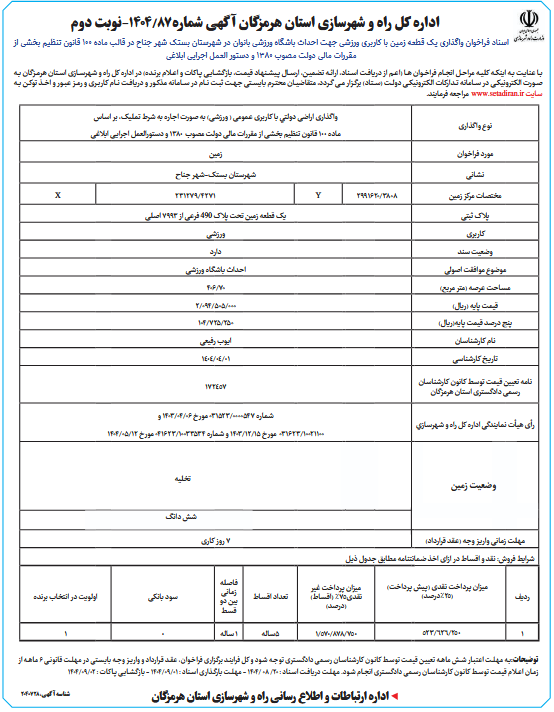با عنایت به اینکه کلیه مراحل انجام فراخوان ها (اعم از دریافت اسناد، ارائه تضمین، ارسال پیشنهاد قیمت، بازگشایی پاکات و اعلام برنده) در اداره کل راه و شهرسازی استان هرمزگان به صورت الکترونیکی در سامانه تدارکات الکترونیکی دولت (ستاد) برگزار می گردد، متقاضیان محترم بایستی جهت ثبت نام در سامانه مذکور و دریافت نام کاربری و رمز عبور و اخذ توکن به سایت www.setadiran.ir مراجعه فرمایند.توضیحات:به مهلت اعتبار شش ماهه تعیین قیمت توسط کانون کارشناسان رسمی دادگستری توجه شود و کل فرایند برگزاری فراخوان، عقد قرارداد و واریز وجه بایستی در مهلت قانونی 6 ماهه از زمان اعلام قیمت توسط کانون کارشناسان رسمی دادگستری انجام شود. مهلت دریافت اسناد : 20/ 08 /1404 - مهلت بارگذاری اسناد : 01/09/1404 - بازگشایی پاکات : 02/09/1404