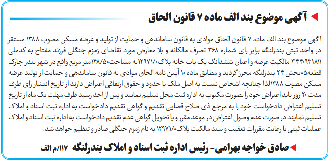 آگهی موضوع بند الف ماده ۷ قانون الحاق موادی به قانون ساماندهی و حمایت از تولید و عرضه مسکن مصوب ۱۳۸۸ مستقر در واحد ثبتی بندرلنگه برابر رای شماره ۳۶۸ تصرف مالکانه و بلا معارض مورد تقاضای زمزم جنگلی فرزند مفتاح به کدملی ۳۴۴۰۹۳۱۸۱۱ مالکیت عرصه و اعیان ششدانگ یک باب خانه پلاک0/12971به مساحت50/148متر مربع واقع در شهر بندر چارک قطعه05بخش ۲۴ بندرلنگه محرز گردید و مطابق ماده ۱۰ آیین نامه الحاق موادی به قانون ساماندهی و حمایت از تولید عرضه مسکن مصوب ۱۳۸۸لذا چنانچه اشخاص نسبت به اصل ملک یا حدود و حقوق ارتفاقی اعتراض دارند از تاریخ انتشار رای ظرف مدت ۲۰ روز باید اعتراض خود را بصورت مکتوب به اداره ثبت محل تسلیم نمایند و پس از اخذ رسید ظرف مهلت یک ماه از تاریخ تسلیم اعتراض دادخواست خود را به مرجع ذی صلاح قضایی تقدیم و گواهی تقدیم دادخواست به اداره ثبت اسناد و املاک تسلیم نمایند در صورت عدم وصول اعتراض در موعد مقرر و یا تحویل گواهی عدم تقدیم دادخواست به اداره ثبت اسناد و املاک عملیات ثبتی با رعایت مقررات تعقیب و سند مالکیت پلاک0/12971 به نام زمزم جنگلی صادر و تنظیم خواهد شد.