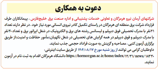 شرکتهای آرمان نیرو هرمزگان و تعاونی خدمات پشتیبانی و اداره صنعت برق خلیجفارس ، پیمانکاران طرف قرارداد شرکت برق منطقه ای هرمزگان در راستای تکمیل کادر نیروی انسانی مورد نیاز خود ، در نظر دارند تعداد 41نفر با مدرک تحصیلی فوق دیپلم و لیسانس رشته های برق و الکترونیک در شغل اپراتور برق و تعداد 30نفر با مدرک دیپلم و فوق دیپلم در همه گرایش های تحصیلی در شغل نگهبان(مأمور حفاظت و امنیت)از طریق برگزاری آزمون کتبی ، مصاحبه و گزینش به صورت قراداد حجمی جذب نمایند.
