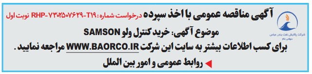 آگهی مناقصه عمومی با اخذ سپرده نوبت اولموضوع آگهی: خرید کنترل ولو SAMSON