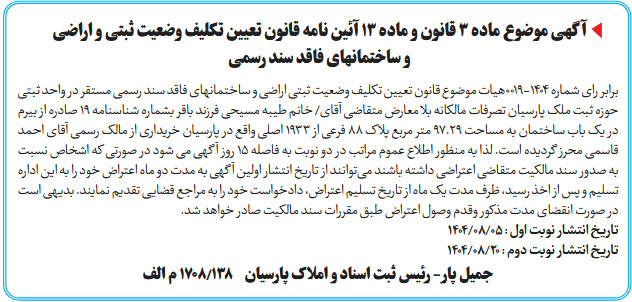 برابر رای شماره ۱۴۰۴-۰۰۱۹هیات موضوع قانون تعیین تکلیف وضعیت ثبتی اراضی و ساختمانهای فاقد سند رسمی مستقر در واحد ثبتی حوزه ثبت ملک پارسیان تصرفات مالکانه بلا معارض متقاضی آقای/ خانم طیبه مسیحی فرزند باقر بشماره شناسنامه ۱۹ صادره از بیرم در یک باب ساختمان به مساحت ۹۷.۲۹ متر مربع پلاک ۸۸ فرعی از ۱۹۳۳ اصلی واقع در پارسیان خریداری از مالک رسمی آقای احمد قاسمی محرز گردیده است. لذا به منظور اطلاع عموم مراتب در دو نوبت به فاصله ۱۵ روز آگهی می شود در صورتی که اشخاص نسبت به صدور سند مالکیت متقاضی اعتراضی داشته باشند میتوانند از تاریخ انتشار اولین آگهی به مدت دو ماه اعتراض خود را به این اداره تسلیم و پس از اخذ رسید، ظرف مدت یک ماه از تاریخ تسلیم اعتراض، دادخواست خود را به مراجع قضایی تقدیم نمایند. بدیهی است در صورت انقضای مدت مذکور وقدم وصول اعتراض طبق مقررات سند مالکیت صادر خواهد شد.