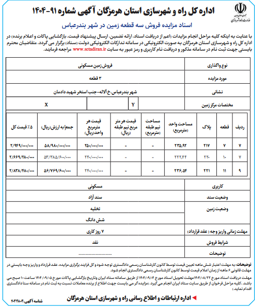 اسناد مزایده فروش سه قطعه زمین در شهر بندرعباس