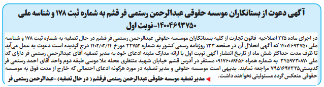 در اجرای ماده 225 اصلاحیه قانون تجارت از کلیه بستانکاران موسسه حقوقی عبدالرحمن رستمی فر قشم در حال تصفیه به شماره ثبت 178 و شناسه ملی 14004693750 که آگهی انحلال آن در صفحه 133 روزنامه رسمی کشور به شماره 22752 مورخ 14/02/1402 درج گردیده است دعوت به عمل میآید تا ظرف مدت حداکثر شش ماه از تاریخ انتشار آگهی نوبت اول با ارائه مدارک مثبته ادعای خود به مدیر تصفیه آقای عبدالرحمن رستمی فر دارای کد ملی 3459730870 به شماره همراه 09176089456 مستقر در آدرس قشم خیابان شهید منتظری محله ملا موسی طبقه دوم واحد آقای احمد رستمی فر کدپستی7951697335 مراجعه نمایند. بدیهی است موسسه حقوقی و مدیر تصفیه در مورد هرگونه ادعای احتمالی که خارج از مدت فوق به موسسه حقوقی منعکس گردد مسئولیتی نخواهند داشت.