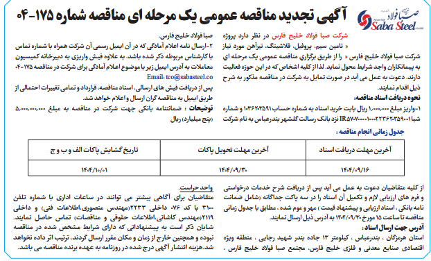 « تامین سیم، پروفیل، فلاشینگ، تیرآهن مورد نیاز شرکت صبا فولاد خلیج فارس « را از طریق برگزاري مناقصه عمومی یک مرحله اي به پيمانكاران واجد شرايط محول نماید. لذا از کلیه اشخاص که در این حوزه فعالیت دارند، دعوت به عمل می آید در صورت تمایل به شرکت در مناقصه مذکور به شرح ذیل اقدام نمایند.