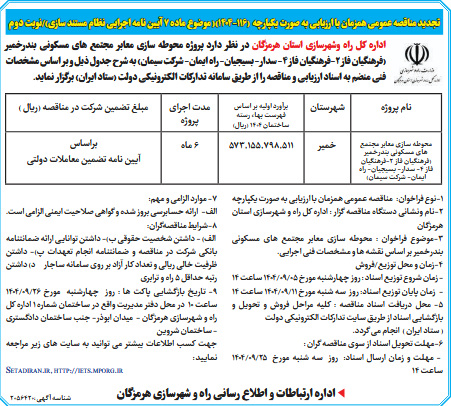 اداره کل راه وشهرسازی استان هرمزگان در نظر دارد پروژه محوطه سازی معابر مجتمع های مسکونی بندرخمیر (فرهنگیان فاز 2-فرهنگیان فاز 4- سدار- بسیجیان- راه ایمان- شرکت سیمان) به شرح جدول ذيل و بر اساس مشخصات فنی منضم به اسناد ارزیابی و مناقصه را از طريق سامانه تدارکات الکترونیکی دولت (ستاد ایران) برگزار نماید.
