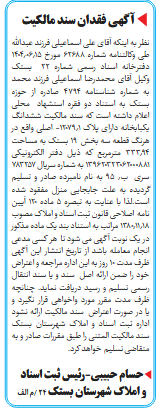 نظر به اینکه آقای علی اسماعیلی فرزند عبدالله طی وکالتنامه شماره ۶۲۶۸۸ مورخ ۱۴۰۴٫۰۶٫۱۵ دفترخانه اسناد رسمی شماره ۲۲ بستک وکیل آقای محمدرضا اسماعیلی فرزند محمد به شماره شناسنامه ۴۷۹۴ صادره از حوزه بستک به استناد دو فقره استشهاد محلی اعلام داشته است که سند مالکیت ششدانگ یکبابخانه دارای پلاک ۱۲۰۷۹٫۱- اصلی واقع در هرنگ قطعه سه بخش ۱۹ بستک به مساحت ۳۳۳٫۹۴ مترمربع که ذیل دفتر الکترونیکی ۱۳۹۶۲۰۳۲۳۰۶۲۰۰۰۸۸۱ به شماره سریال ۷۸۳۲۵۷ سری ب٫ ۹۵ به نام نامبرده صادر و تسلیم گردیده به علت جابجایی منزل مفقود شده است.لذا با عنایت به تبصره ۵ ماده ۱۲۰ آیین نامه اصلاحی قانون ثبت اسناد و املاک مصوب ۱۳۸۰٫۱۱٫۱۸ مراتب به استناد بند یک ماده مذکور در یک نوبت آگهی می شود تا هر کسی مدعی انجام معامله باشد از تاریخ انتشار این آگهی ظرف مدت ۱۰ روز به این اداره مراجعه و اعتراض خود را ضمن ارائه اصل سند و یا سند انتقال رسمی تسلیم و رسید دریافت نماید. چنانچه ظرف مدت مقرر مورد واخواهی قرار نگیرد و یا در صورت اعتراض سند مالکیت ارائه نشود اداره ثبت اسناد و املاک شهرستان بستک سند مالکیت المثنی را طبق مقررات صادر و به متقاضی تسلیم خواهد کرد.