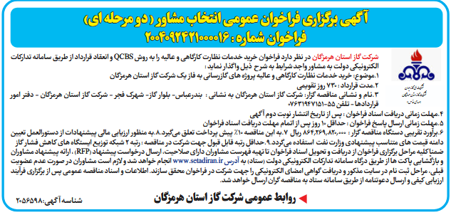 شرکت گاز استان هرمزگان در نظر دارد فراخوان خرید خدمات نظارت کارگاهی و عالیه را به روش QCBS و انعقاد قرارداد از طریق سامانه تدارکات الکترونیکی دولت به مشاور واجد شرایط به شرح ذیل واگذار نماید :