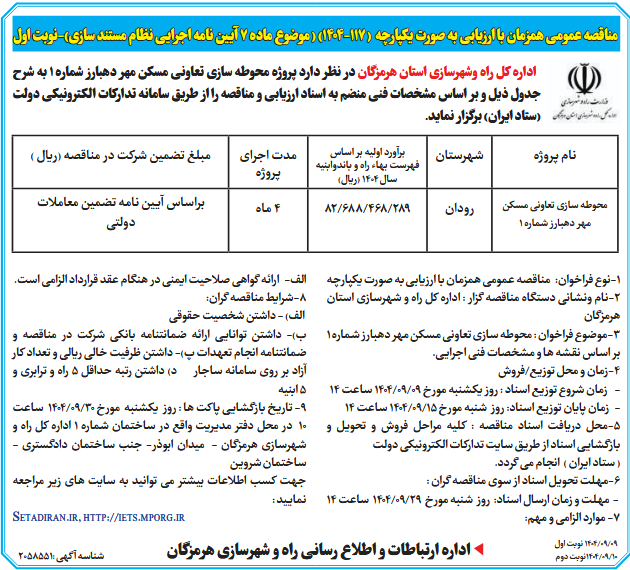اداره کل راه وشهرسازی استان هرمزگان در نظر دارد پروژه محوطه سازی تعاونی مسکن مهر دهبارز شماره 1 به شرح جدول ذیل و بر اساس مشخصات فنی منضم به اسناد ارزیابی و مناقصه را از طریق سامانه تدارکات الکترونیکی دولت (ستاد ایران) برگزار نماید.