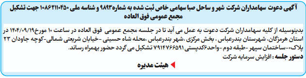 بدینوسیله از کلیه سهامداران شرکت دعوت به عمل می آید تا در جلسه مجمع عمومی فوق العاده در ساعت 10 مورخ19/09/1404 در استان هرمزگان، شهرستان بندرعباس ، بخش مرکزی ،شهر بندرعباس ،محله شاه حسینی -خیابان شریعتی شمالی-کوچه جاودان 23 پلاک0-ساختمان سپهر -طبقه دوم -واحد6کدپستی 7914766591 تشکیل می گردد حضور بهمراه رساند.