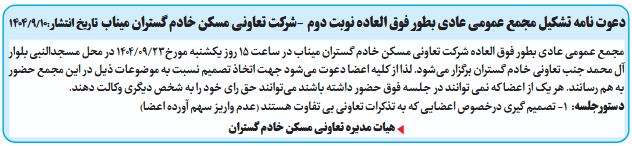 مجمع عمومی عادی بطور فوق العاده شرکت تعاونی مسکن خادم گستران میناب در ساعت 15 روز یکشنبه مورخ23/09/1404 در محل مسجدالنبی بلوار آل محمد جنب تعاونی خادم گستران برگزار میشود. لذا از کلیه اعضا دعوت میشود جهت اتخاذ تصمیم نسبت به موضوعات ذیل در این مجمع حضور به هم رسانند. هر یک از اعضا که نمی توانند در جلسه فوق حضور داشته باشند میتوانند حق رای خود را به شخص دیگری وکالت دهند.