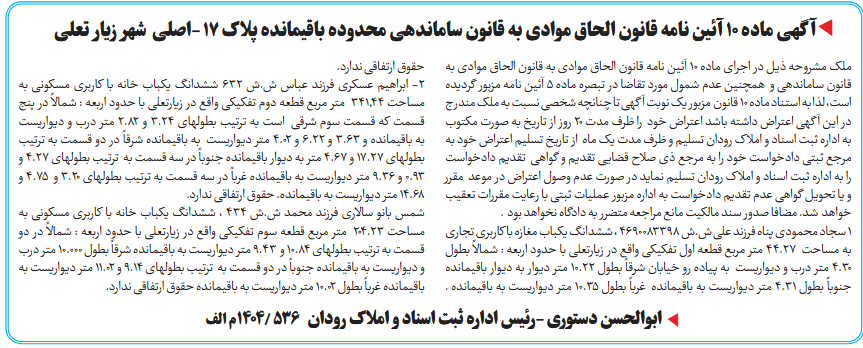 ملک مشروحه ذیل در اجرای ماده ۱۰ آئین نامه قانون الحاق موادی به قانون الحاق موادی به قانون ساماندهی و همچنین عدم شمول مورد تقاضا در تبصره ماده ۵ آئین نامه مزبور گردیده است، لذا به استناد ماده ۱۰ قانون مزبور یک نوبت آگهی تا چنانچه شخصی نسبت به ملک مندرج در این آگهی اعتراض داشته باشد اعتراض خود را ظرف مدت ۲۰ روز از تاریخ به صورت مکتوب به اداره ثبت اسناد و املاک رودان تسلیم و ظرف مدت یک ماه از تاریخ تسلیم اعتراض خود به مرجع ثبتی دادخواست خود را به مرجع ذی صلاح قضایی تقدیم و گواهی تقدیم دادخواست را به اداره ثبت اسناد و املاک رودان تسلیم نماید در صورت عدم وصول اعتراض در موعد مقرر و یا تحویل گواهی عدم تقدیم دادخواست به اداره مزبور عملیات ثبتی با رعایت مقررات تعقیب خواهد شد. مضافا صدور سند مالکیت مانع مراجعه متضرر به دادگاه نخواهد بود .